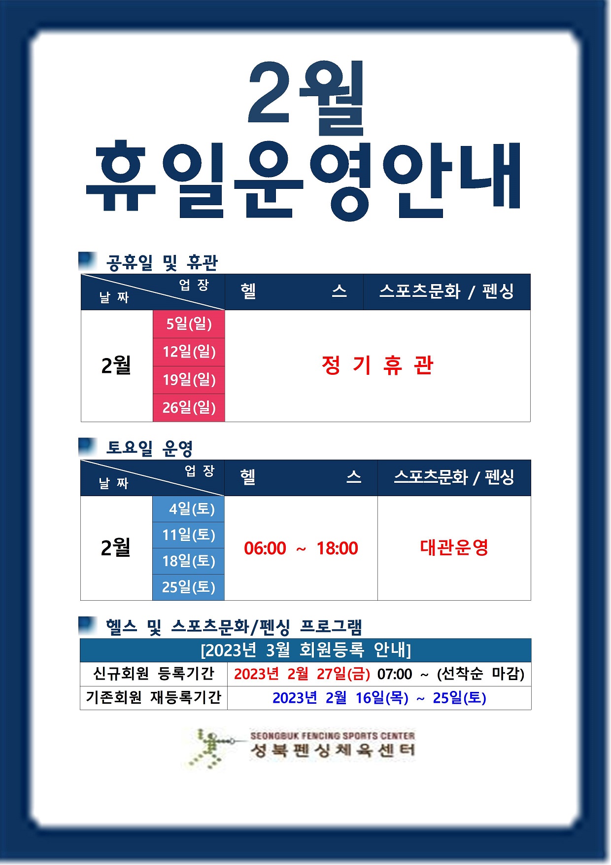 날짜 : 2월 5일, 12일, 19일, 26일(일) - 업장 : 헬스 / 스포츠문화 및 펜싱 정기휴관