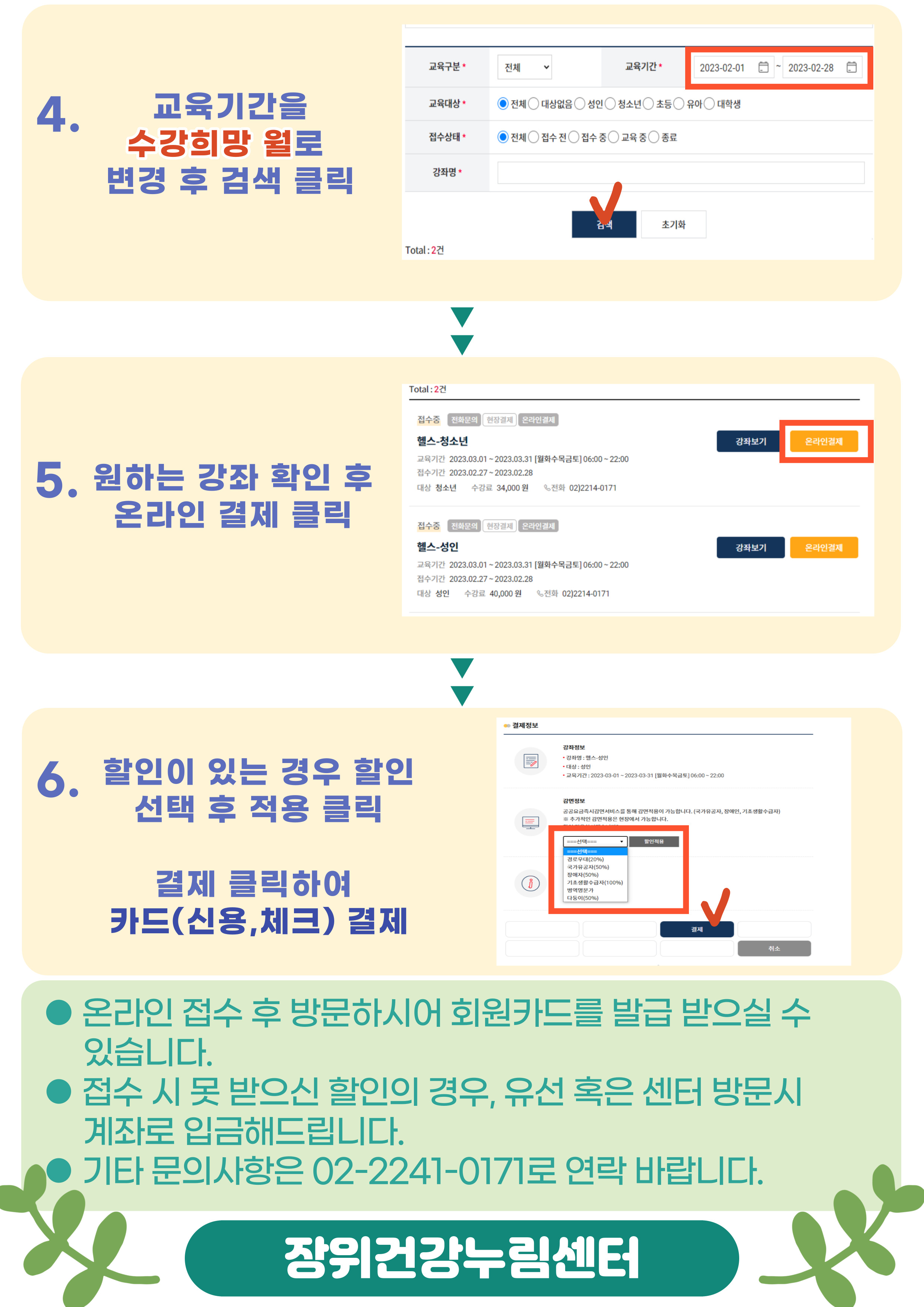 - 6) 할인이 있는 경우 할인 선택 후 적용 클릭, 결제 클릭하여 카드(신용, 체크) 결제