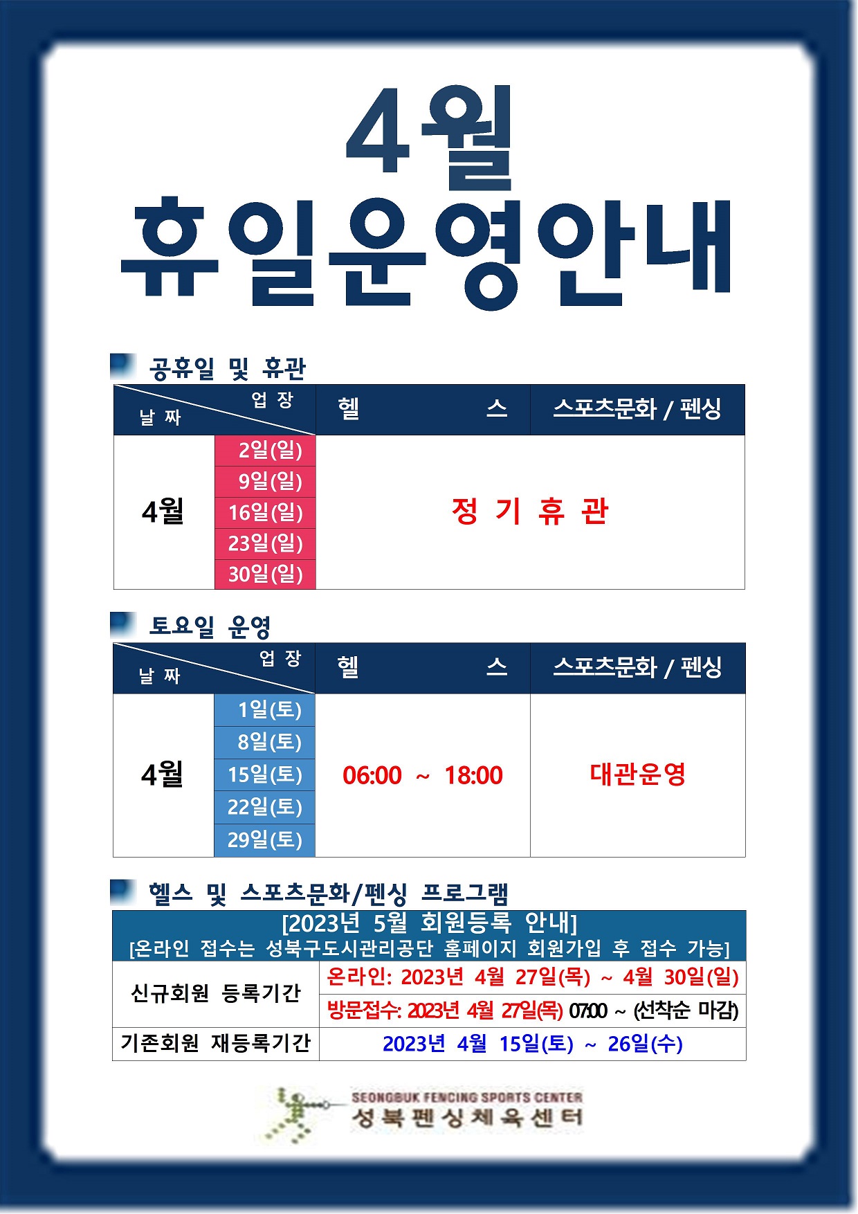 *날짜 - 4월 2일 / 9일 / 16일 / 23일 / 30일 → 업장 - 헬스/스포츠문화/펜싱 : 정기휴관