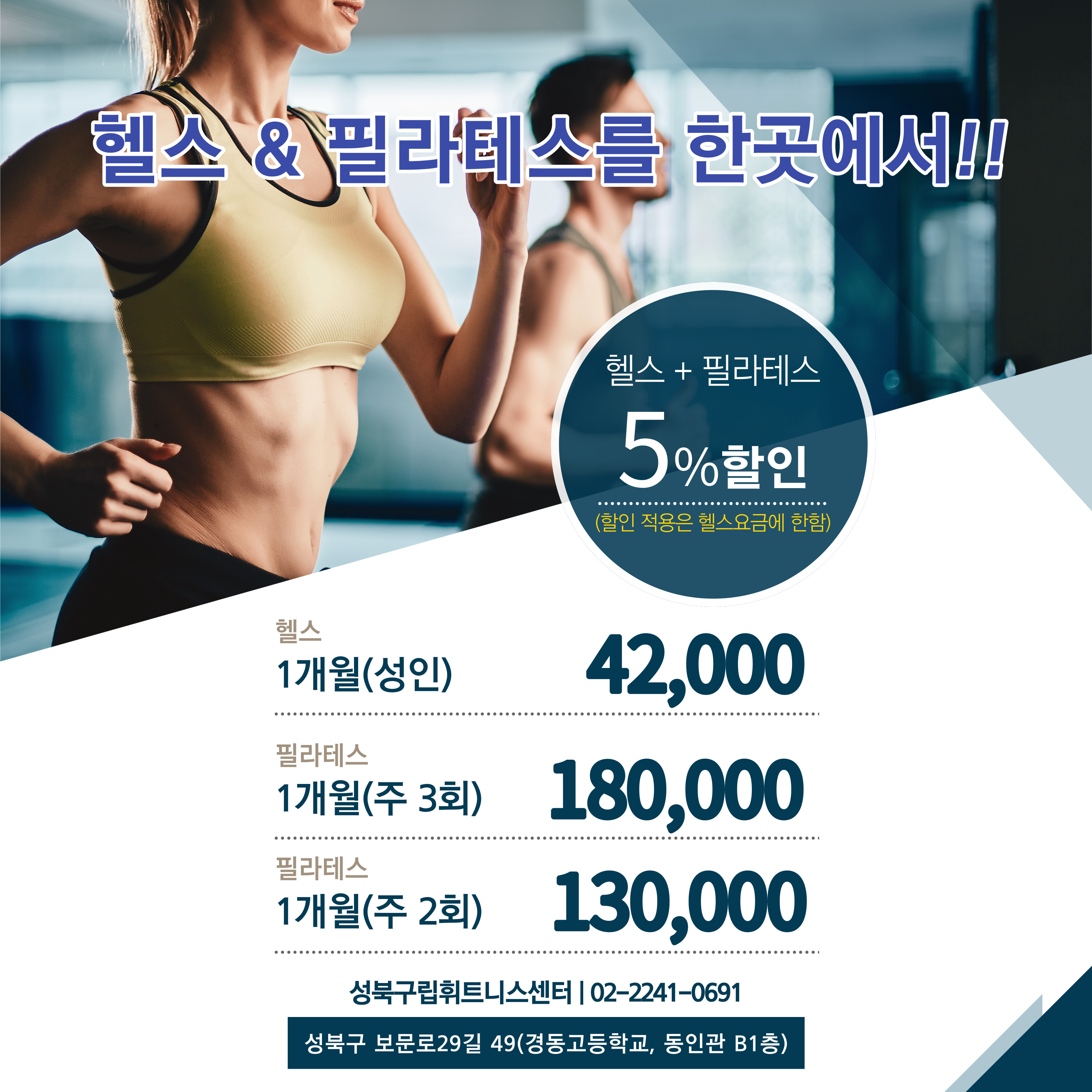 헬스 + 필라테스 5%할인(할인 적용은 헬스요금에 한함)