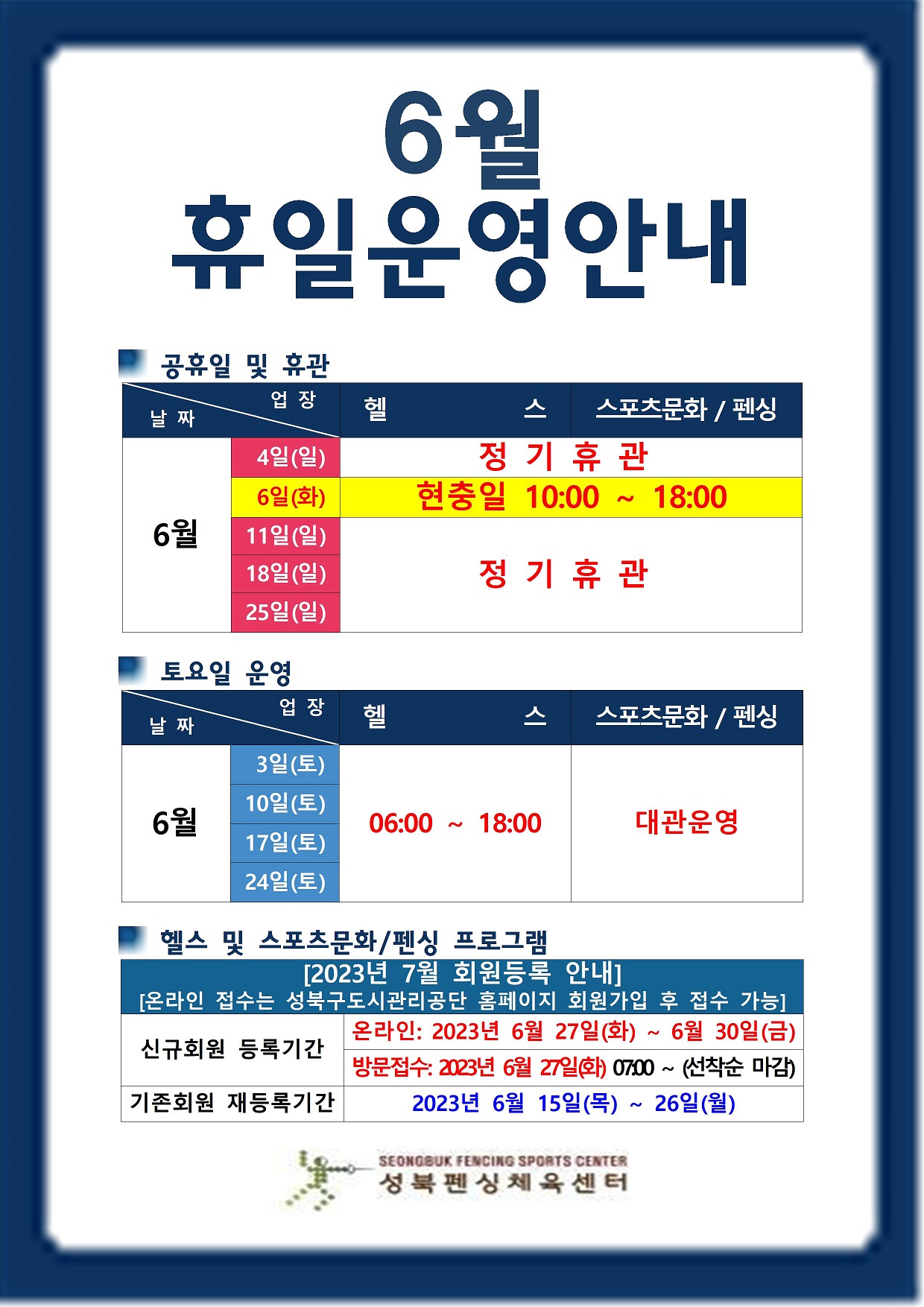 * 날짜 - 6월 6일(화) → 현충일 : 업장 - 헬스/스포츠문화/펜싱 : 공휴일 운영(10:00 ~ 18:00)