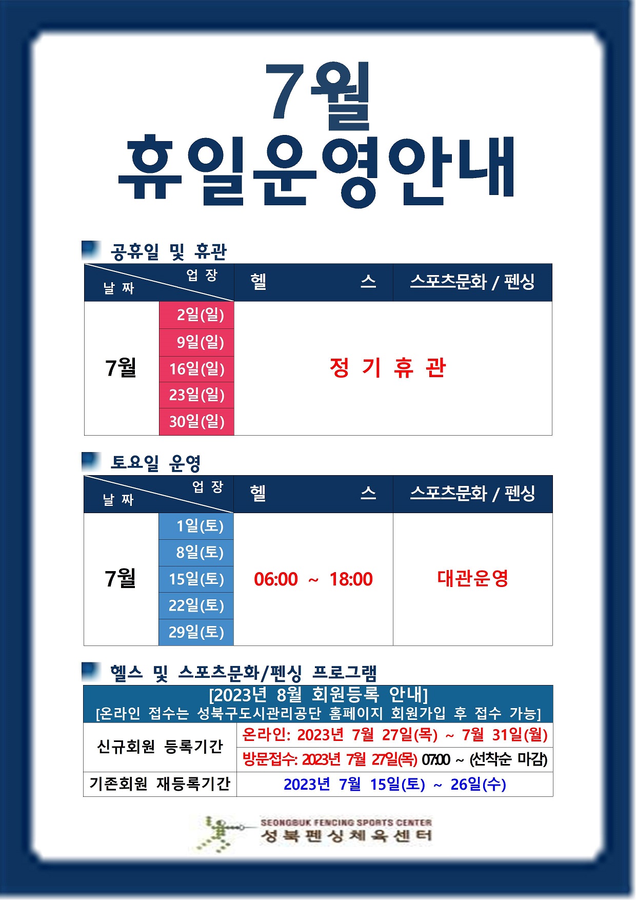 * 날짜 - 7월 2일(일), 9일(일), 16일(일), 23일(일), 30일(일)→ 업장 - 헬스/스포츠문화/펜싱 : 정기휴관