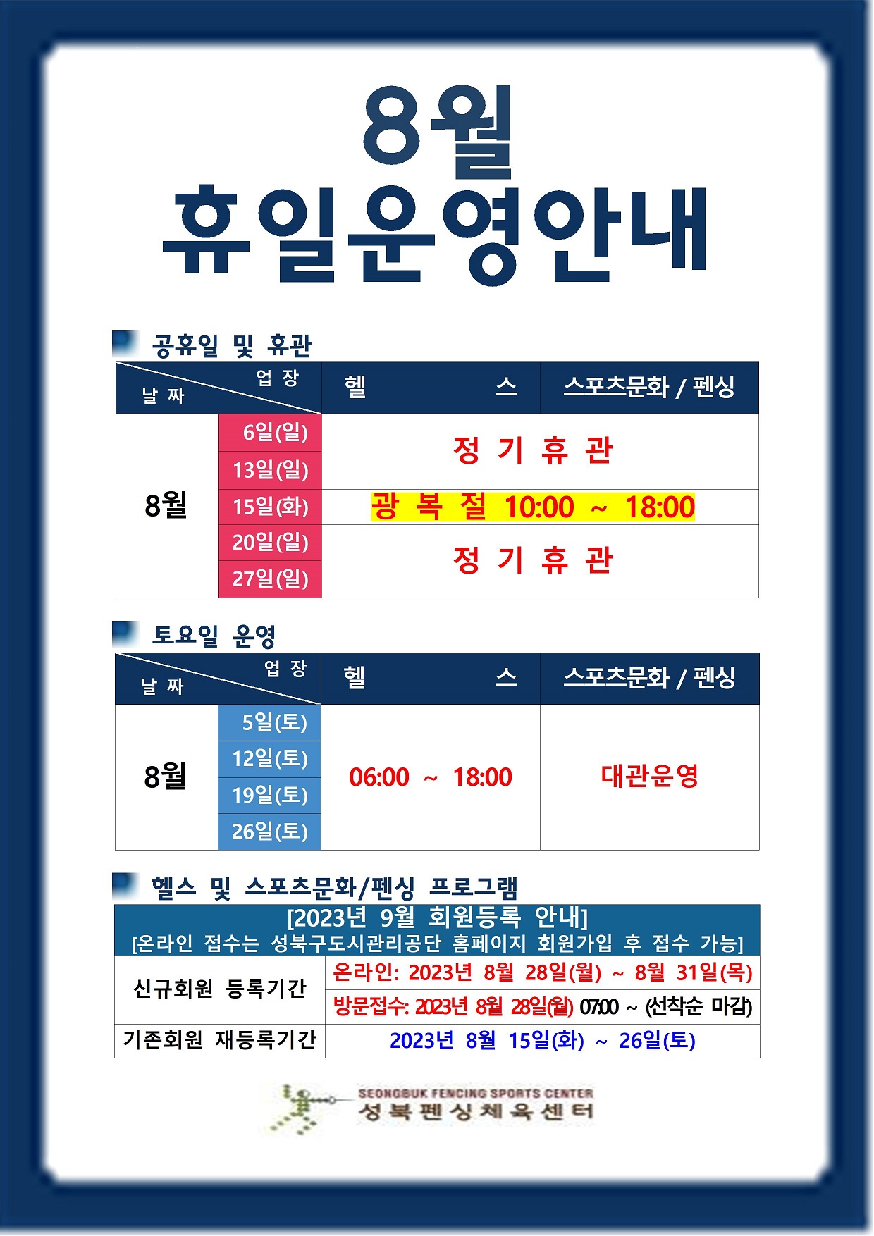 * 날짜 - 8월 15일(화-광복절) → 업장 - 헬스/스포츠문화/펜싱 : 10:00~18:00