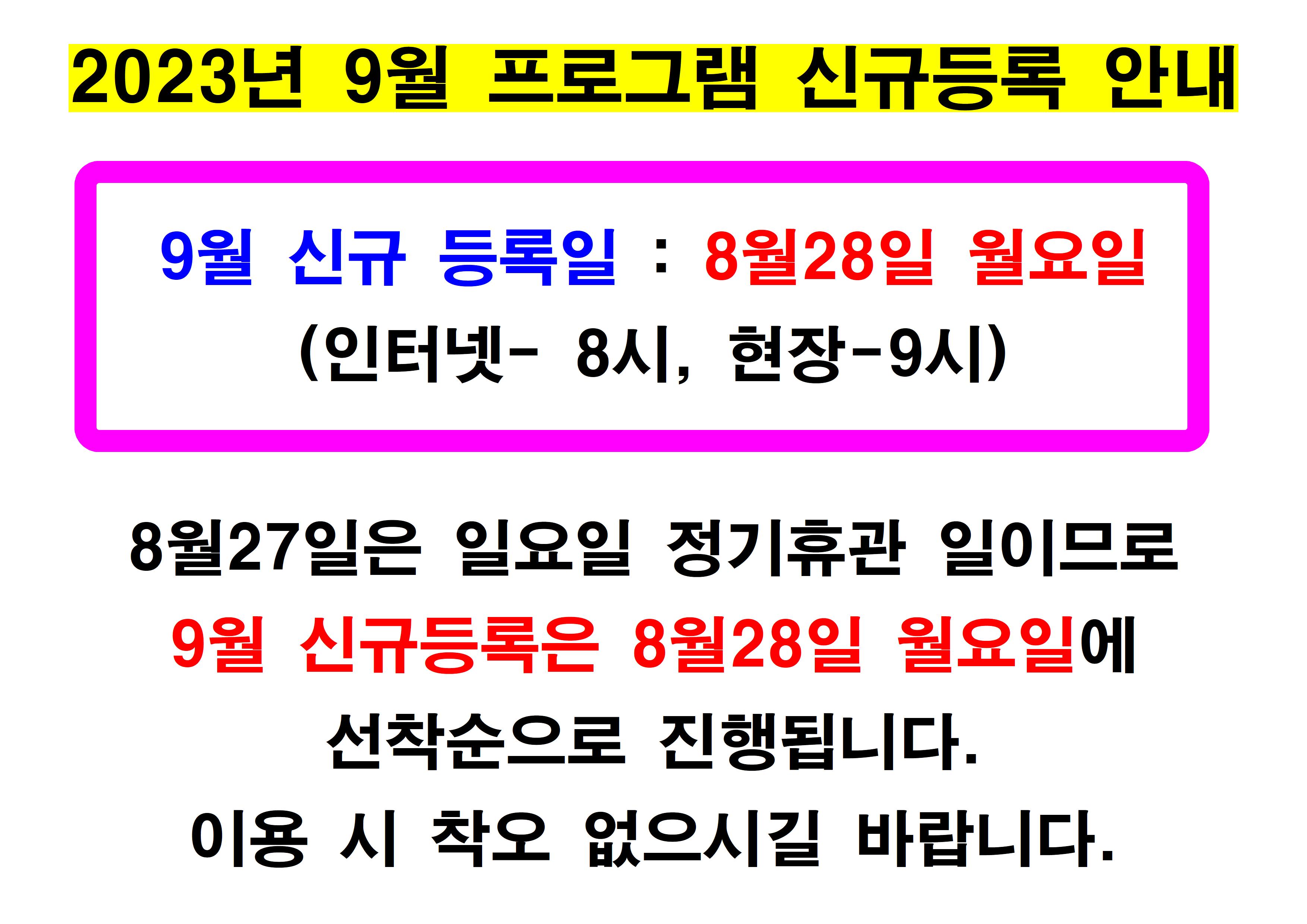 9월 신규등록은 8월28일 월요일에 선착순으로 진행됩니다. 이용 시 착오 없으시길 바랍니다.