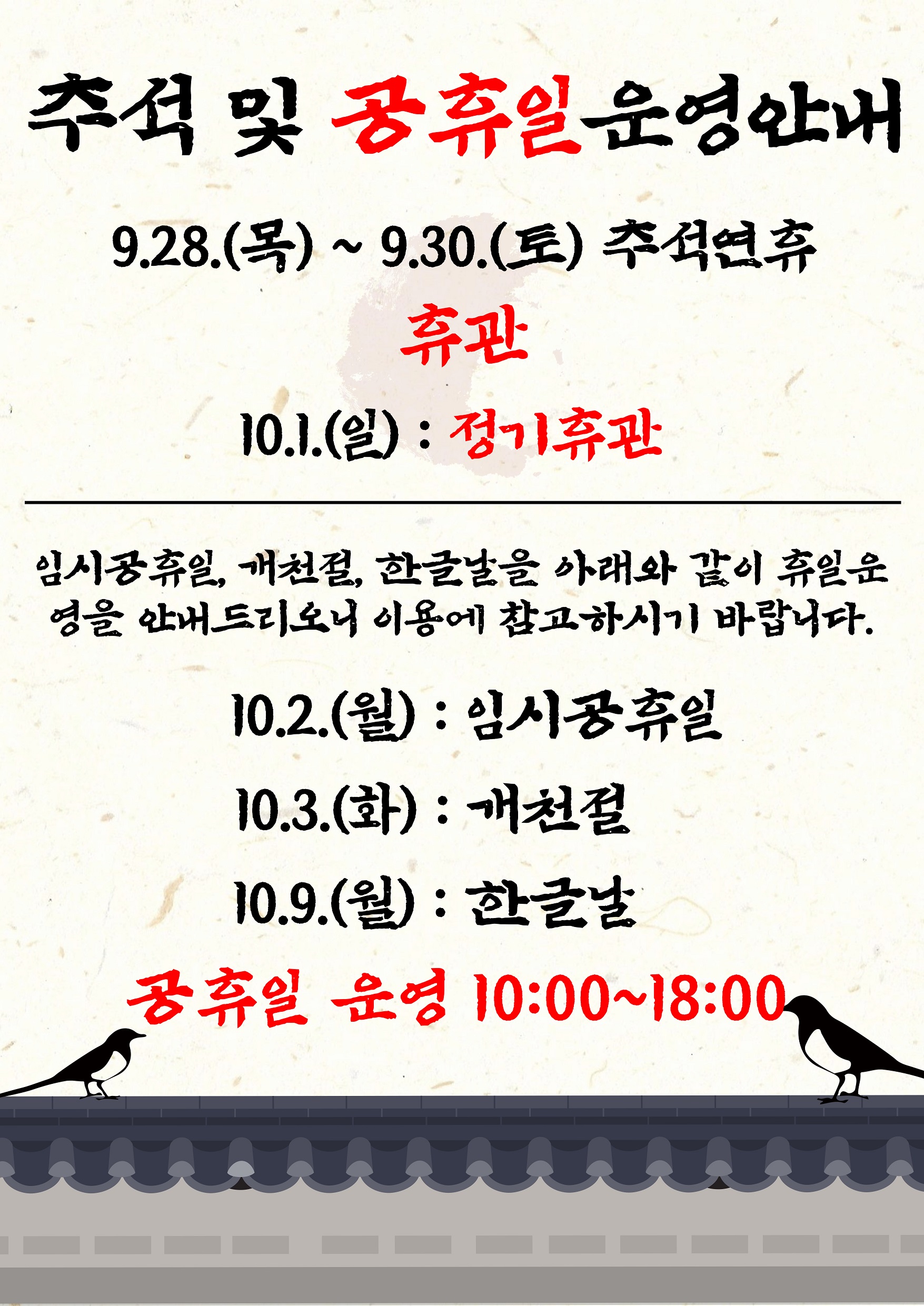 10.2.(월) : 임시공휴일 → 공휴일 운영 10:00 ~ 18:00