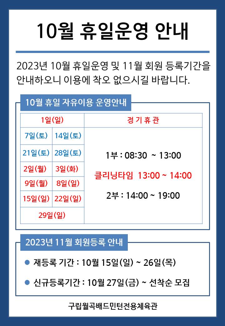 2023년 10월 휴일운영 및 2023년 11월 회원등록기간을 안내하오니 이용에 착오 없으시길 바랍니다.