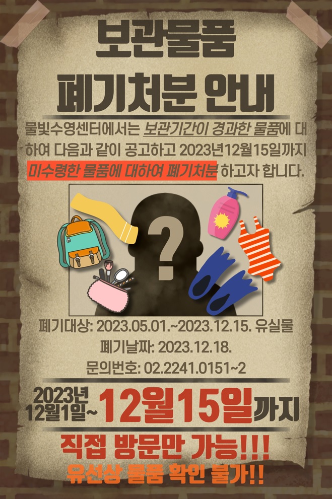 물빛수영센터에서는 보관기간이 경과한 물품에 대하여 다음과 같이 공고하고