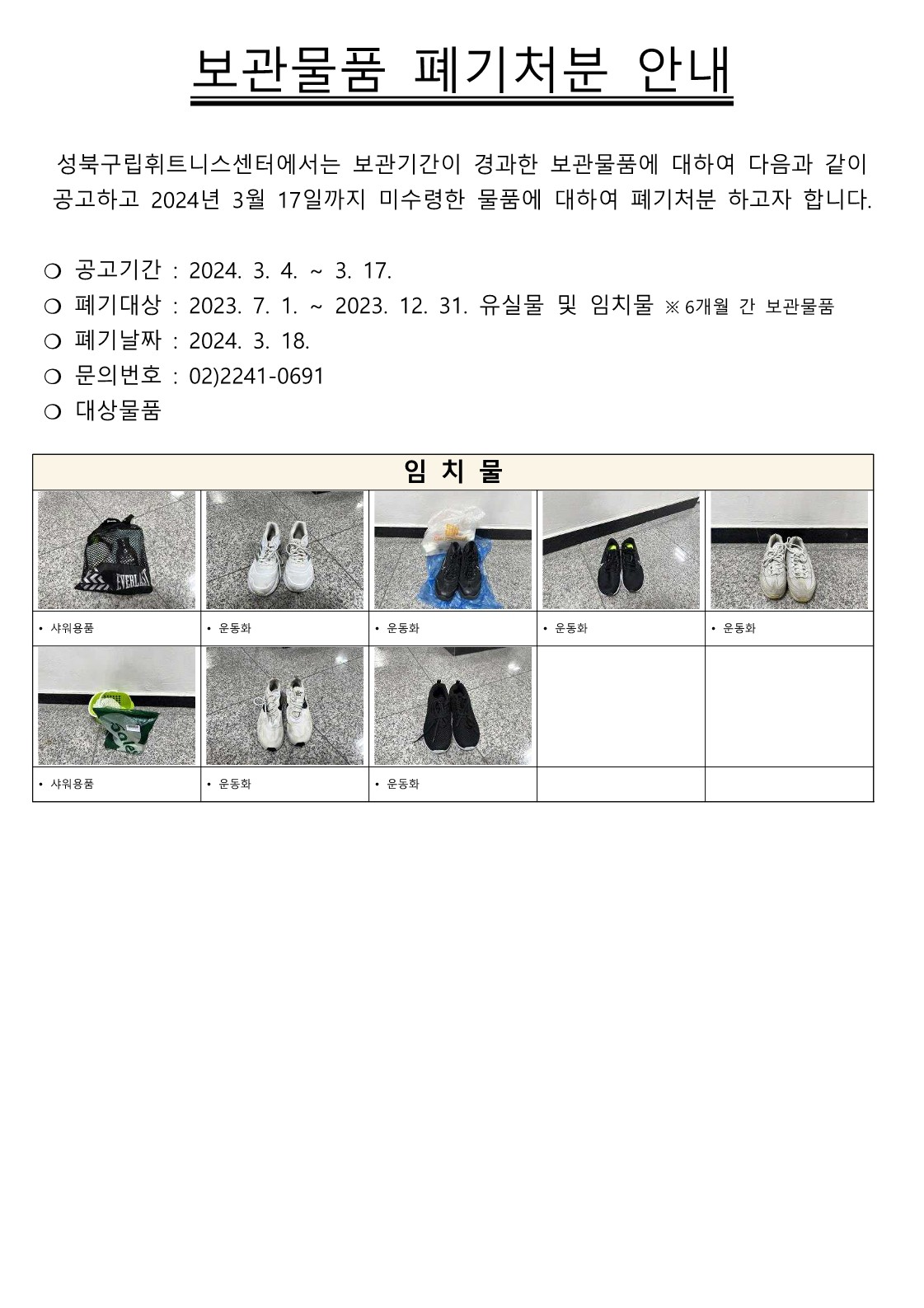 성북구립휘트니스센터 보관물품 폐기처리안내