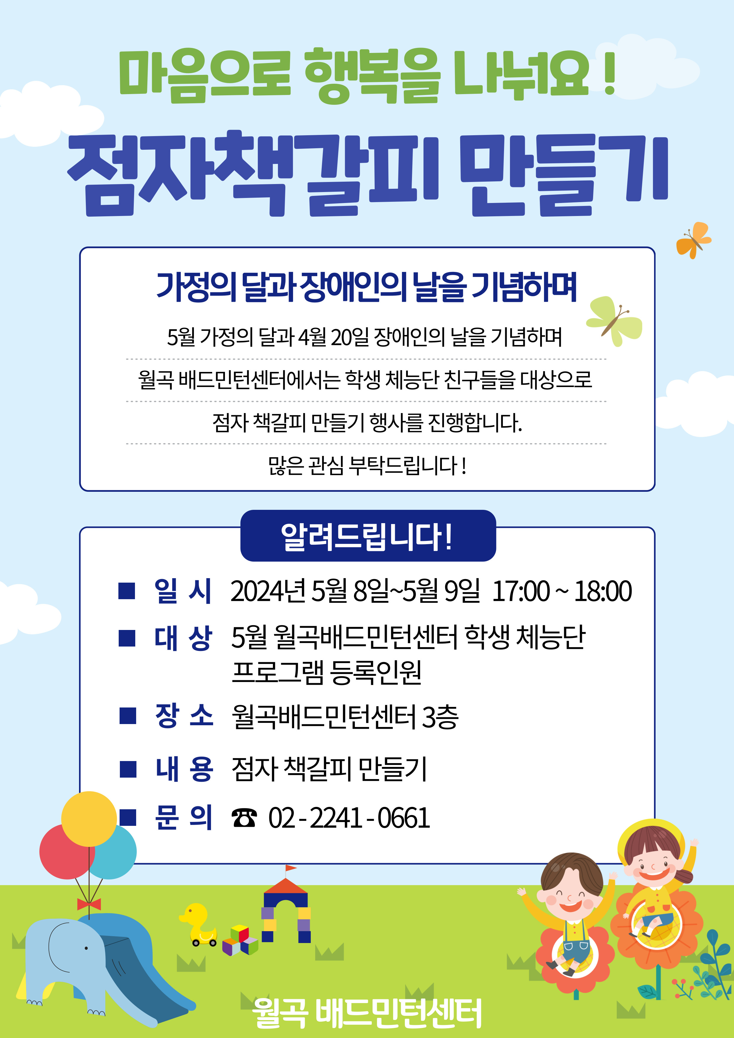 5월 가정의 달과 4월 20일 장애인의 날을 기념하며 월곡 배드민턴센터에서는 학생 체능단 친구들을 대상으로 점자 책갈피 만들기 행사를 진행합니다.