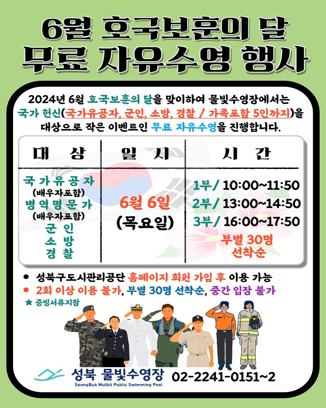 2024년 6월 호국보훈의 달을 맞이하여 물빛수영장에서는 국가 헌신(국가유공자,병역명문가,군인,소방,경찰 / 가족포함 5인까지)을