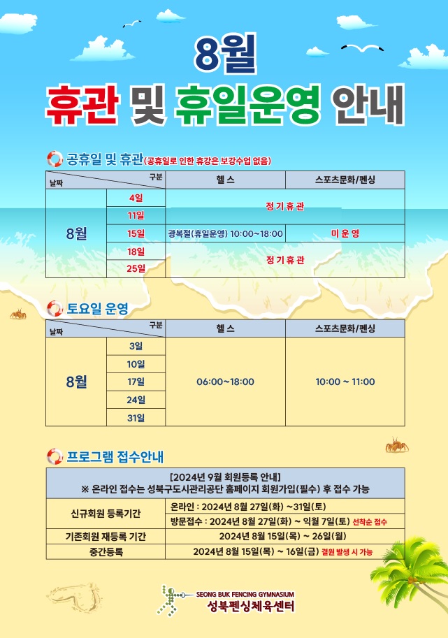 광복절(휴일운영- 헬스 / 스포츠문화및 펜싱 미운영) - 06:00~18:00