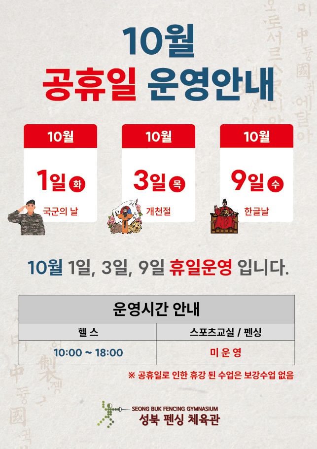 10월 1일, 3일, 9일 휴일운영 입니다.