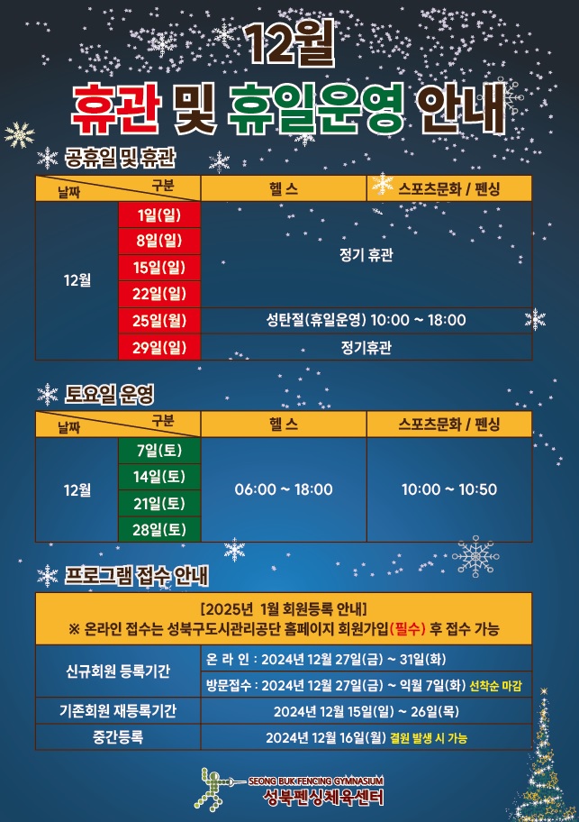 * 기존회원 재등록 기간 : 2024년 12월 15일(일) ~ 26일(목)