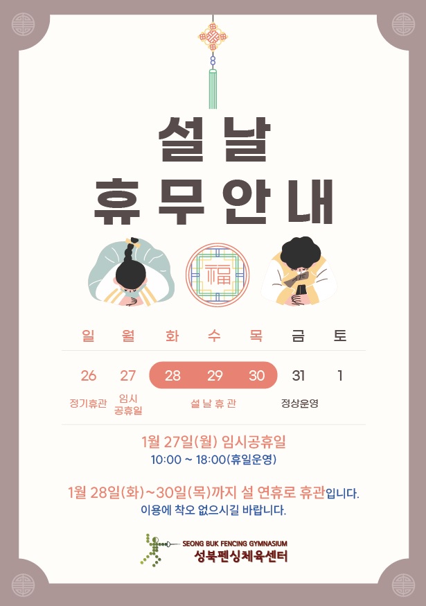 28일(화)~30일(목) : 설 연휴 휴관